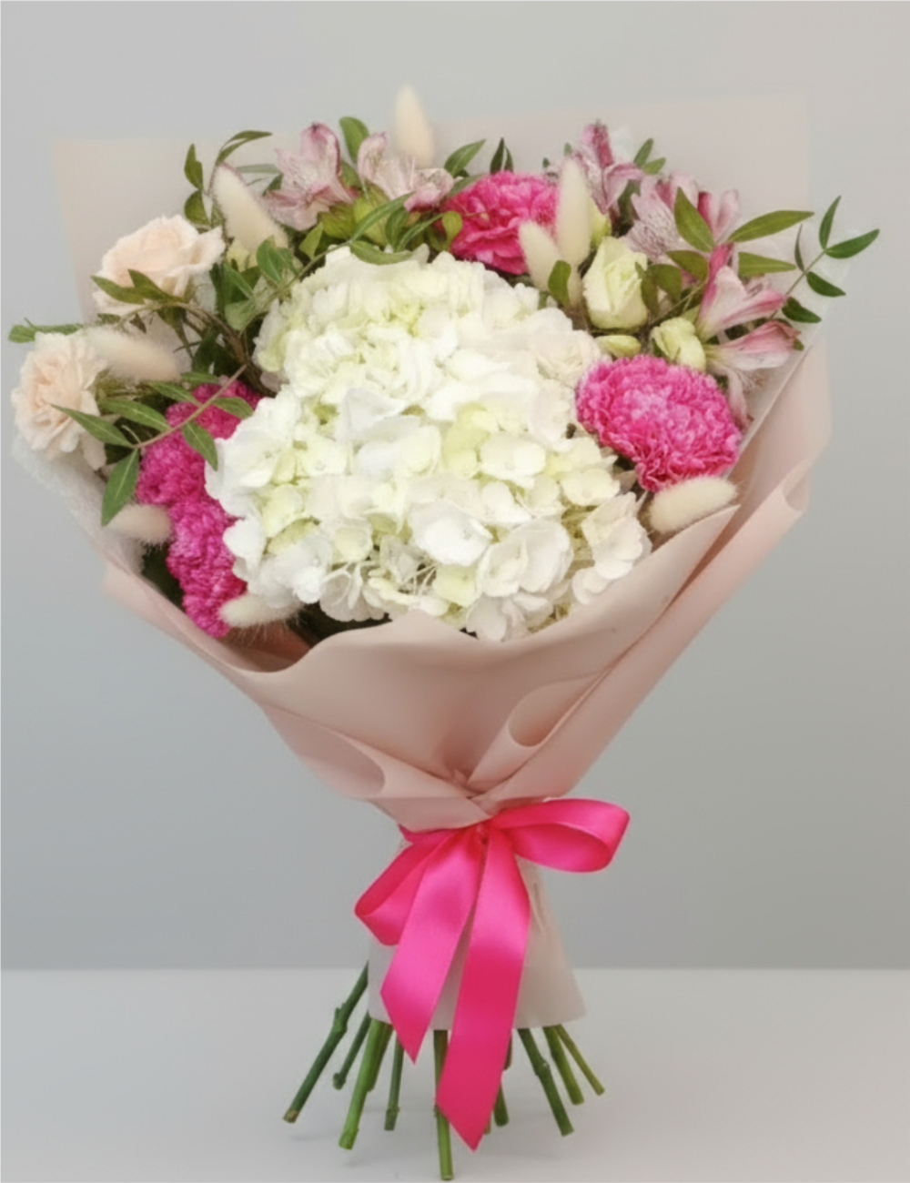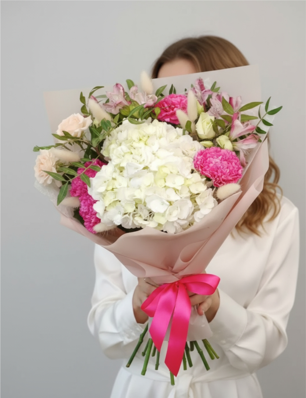 Роза, Альстромерия, Диантус, лагурус, Гортензия