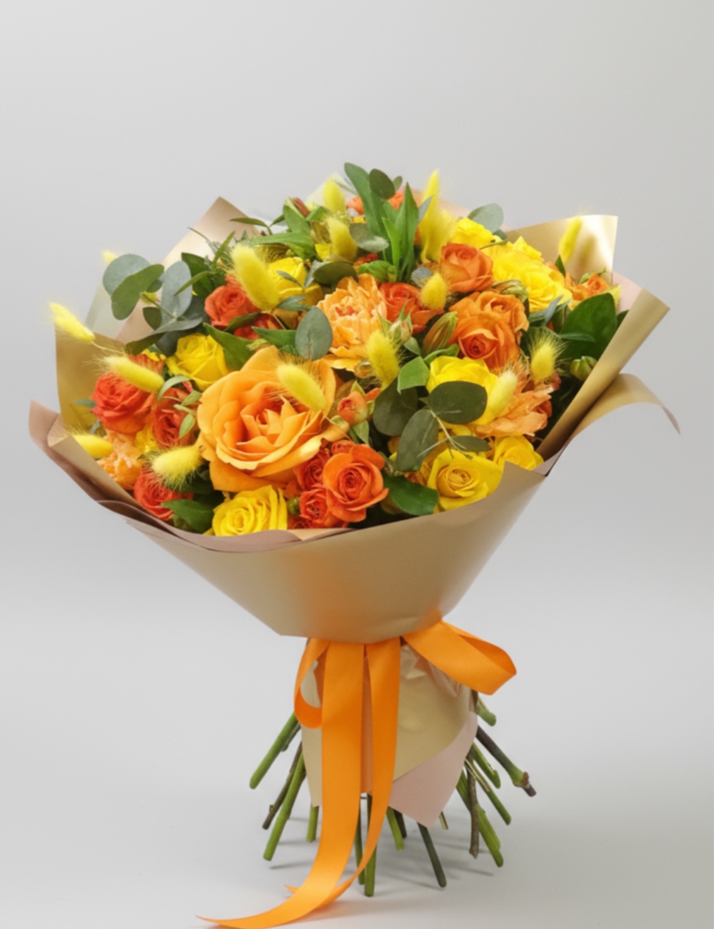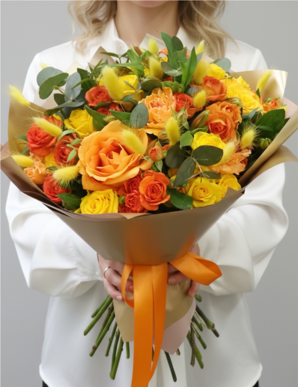 Роза кустовая - 3 шт.роза кения - 8 шт.Альстромерия - 3 шт.Диантус - 5 шт.Лагурус - 15 шт.Упаковка - 1 шт.Писташ - 1 шт.
