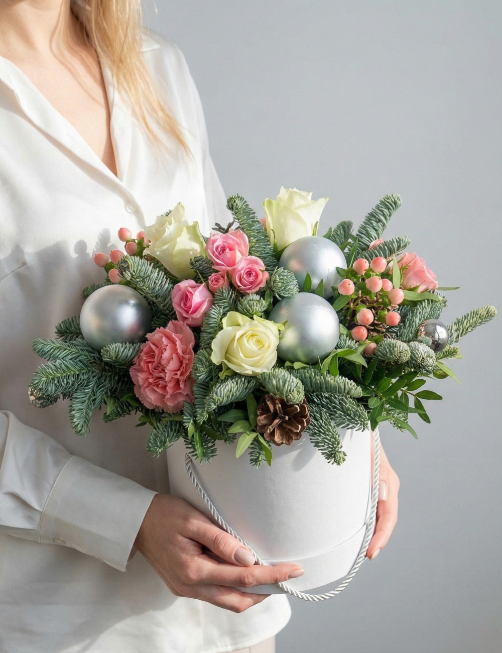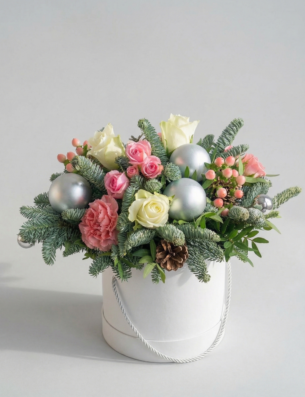 Цветочная композиция создаёт атмосферу праздничного уюта. Ёлочные игрушки дополняют композицию, придавая ей завершённость и нарядность. Всё это гармонично делает композицию изысканной и оригинальной.