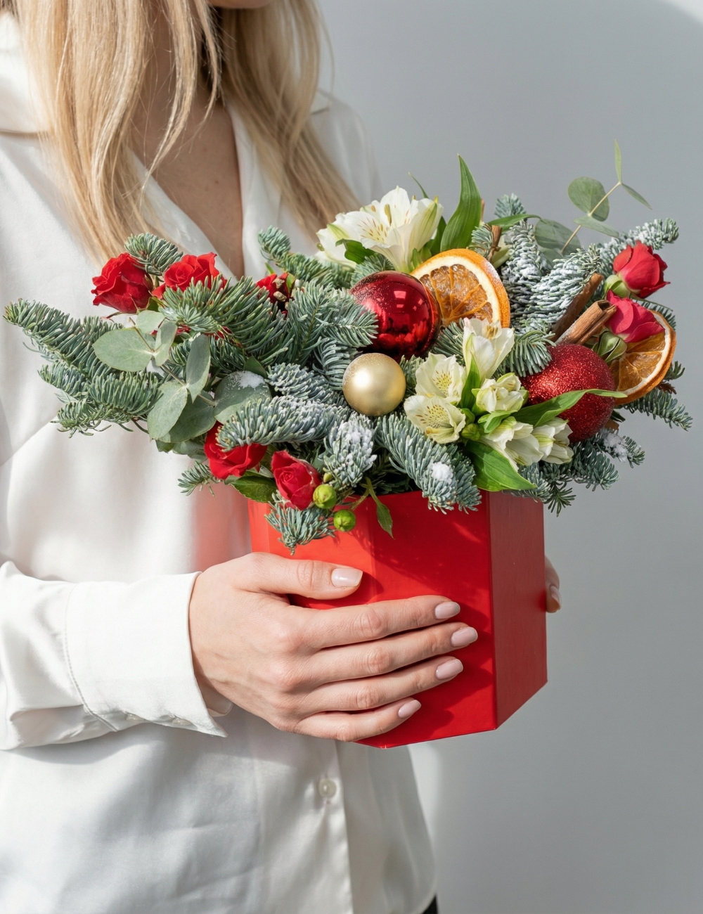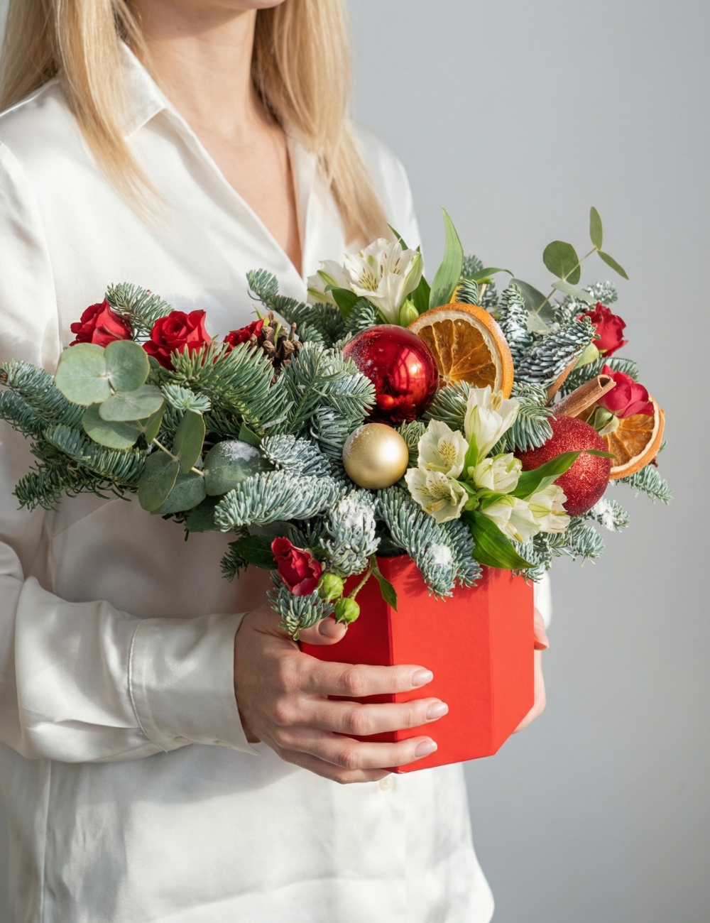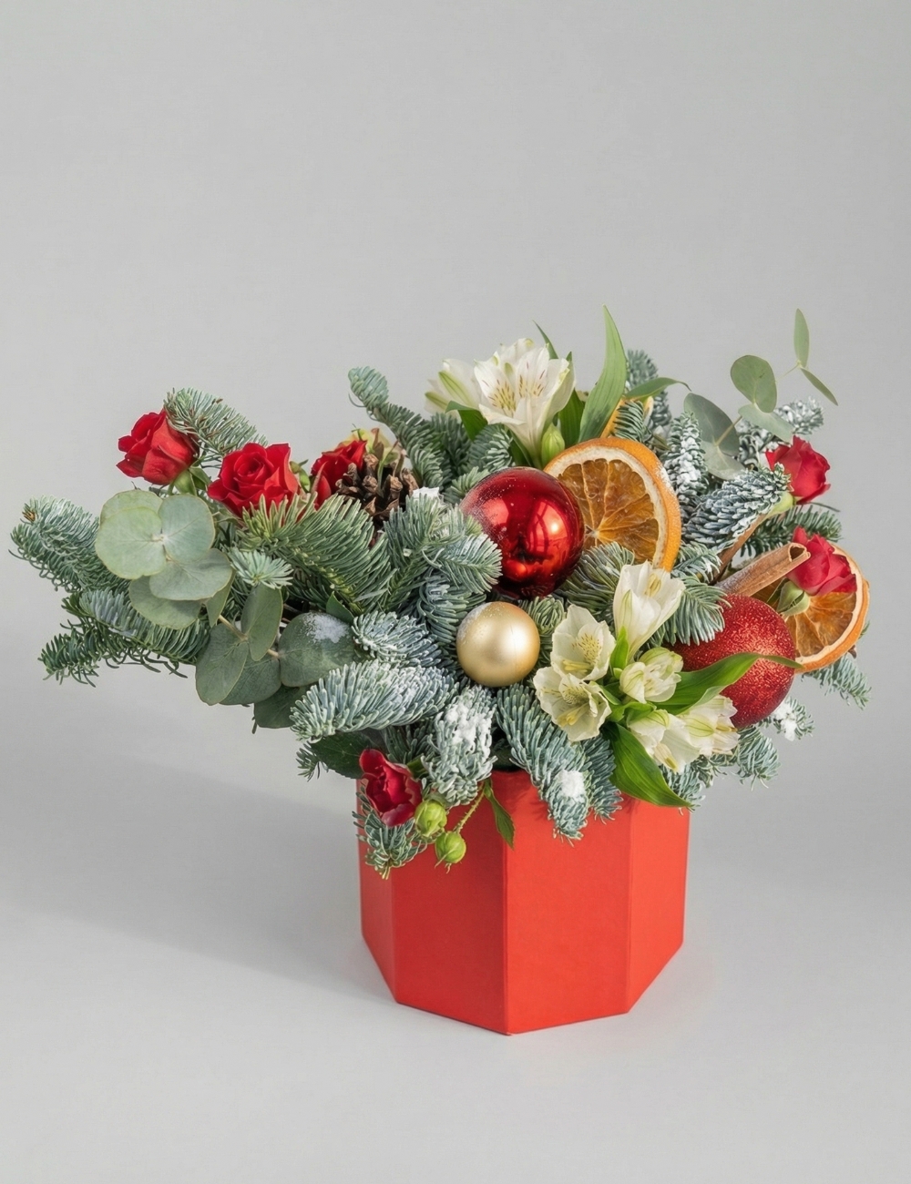 Создайте праздничное настроение в вашем доме с помощью этой удивительной композиции! В ней гармонично сочетаются нобилис, эвкалипт, ёлочные игрушки, альстромерии, сушёный апельсин, корица, шишки и кустовые розы. Всё это аккуратно уложено в круглую красную коробку, которая станет прекрасным дополнением к вашему интерьеру.